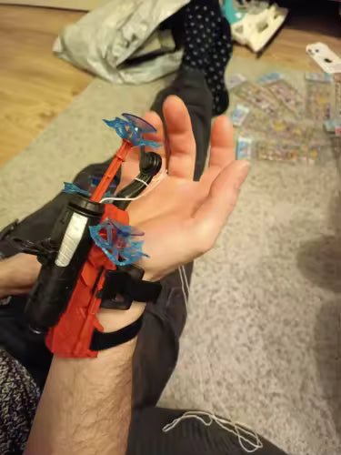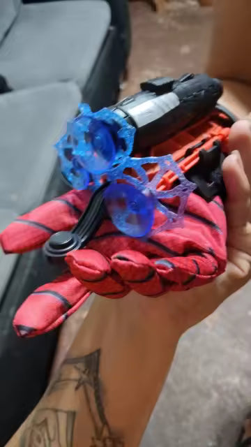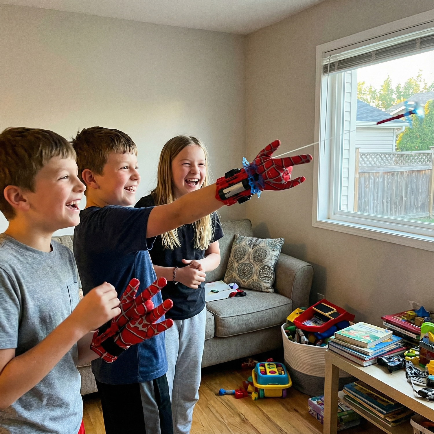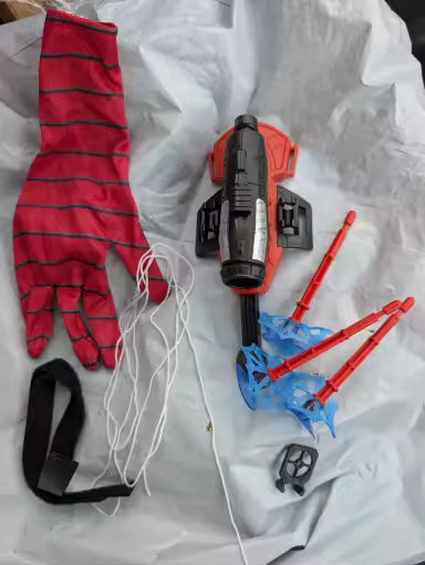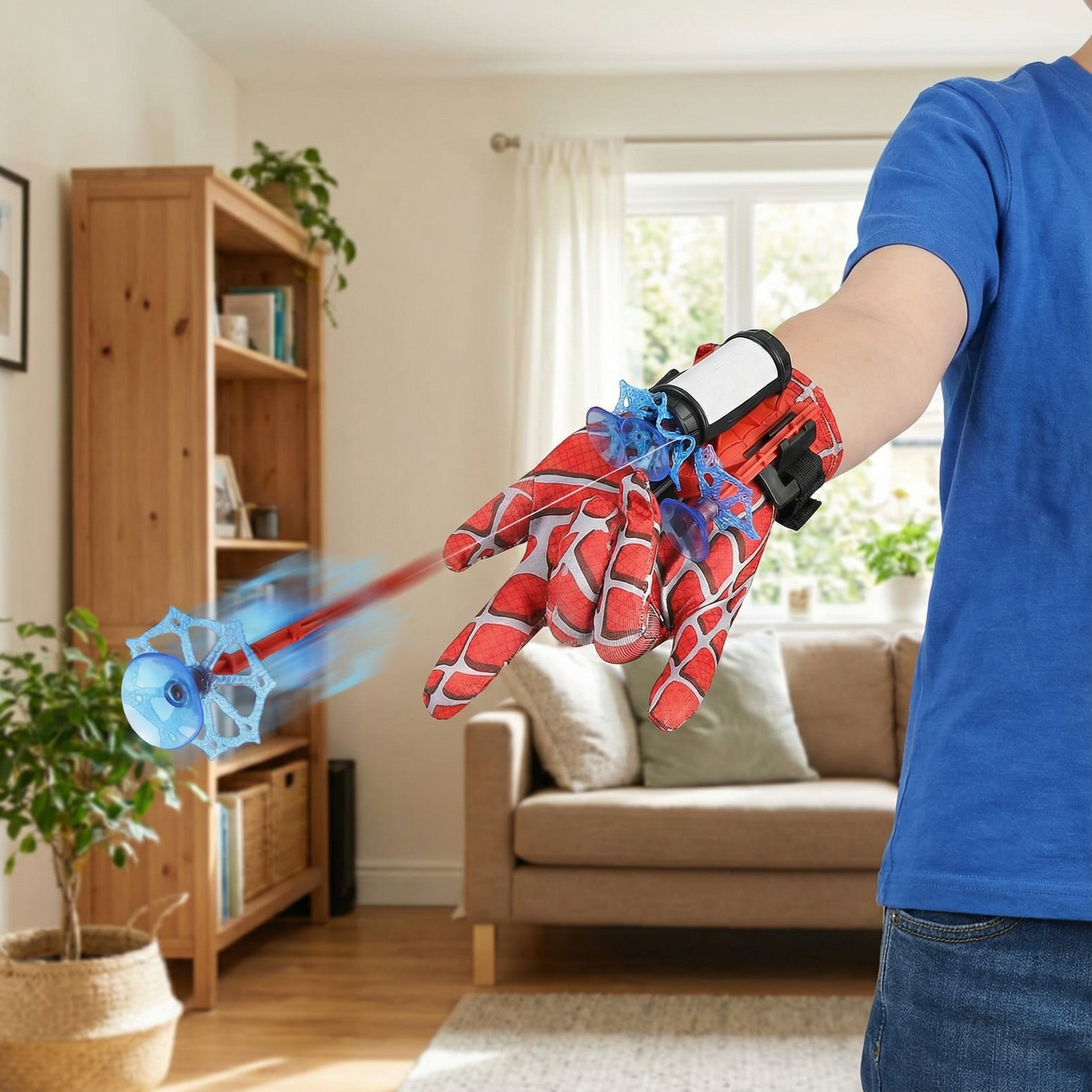 Sträck ut handen och se nätet flyga genom rummet. Den här handsken gör det möjligt att skjuta riktiga nät med sugproppar som fastnar på väggar, dörrar, flaskor eller andra ytor hemma. Det är en lek som känns på riktigt.